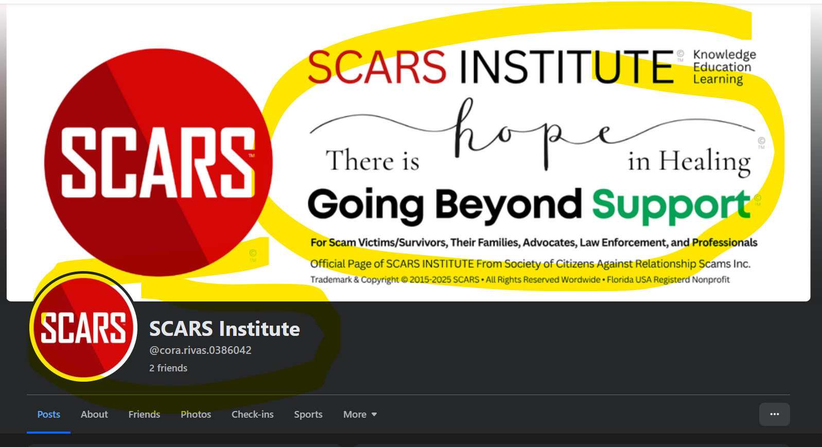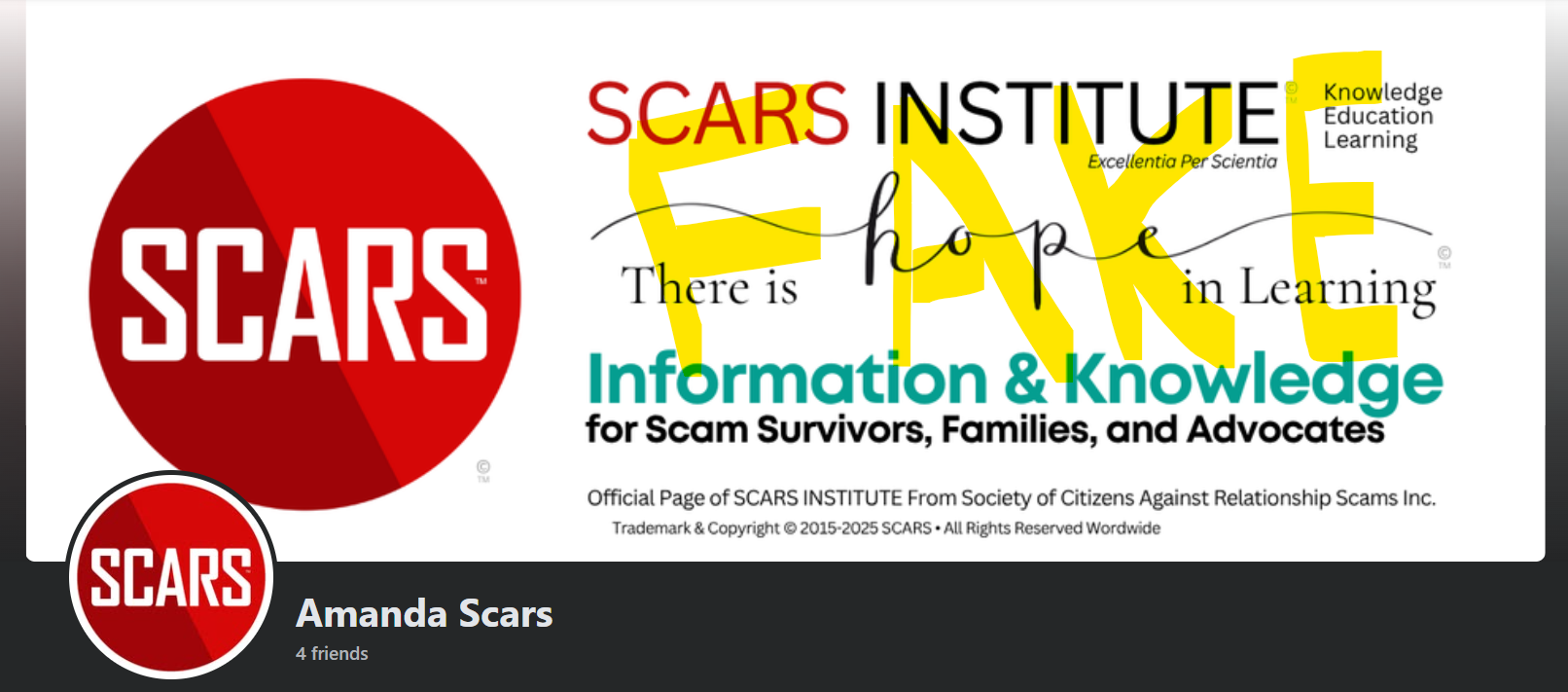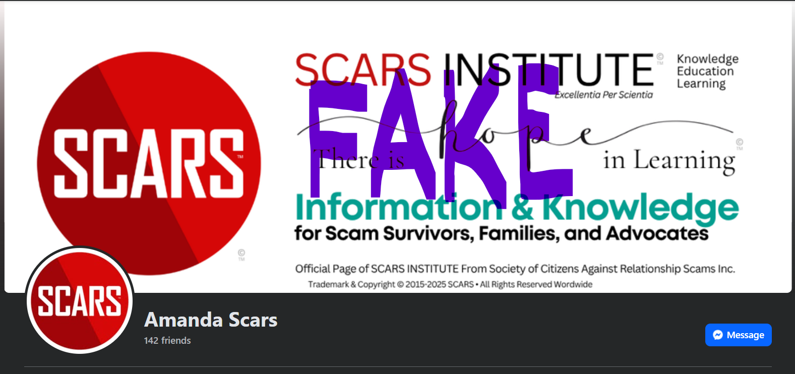 To date we have found a total of 17 pages/profiles on Facebook that are impersonating one or more of our official SCARS Institute pages.